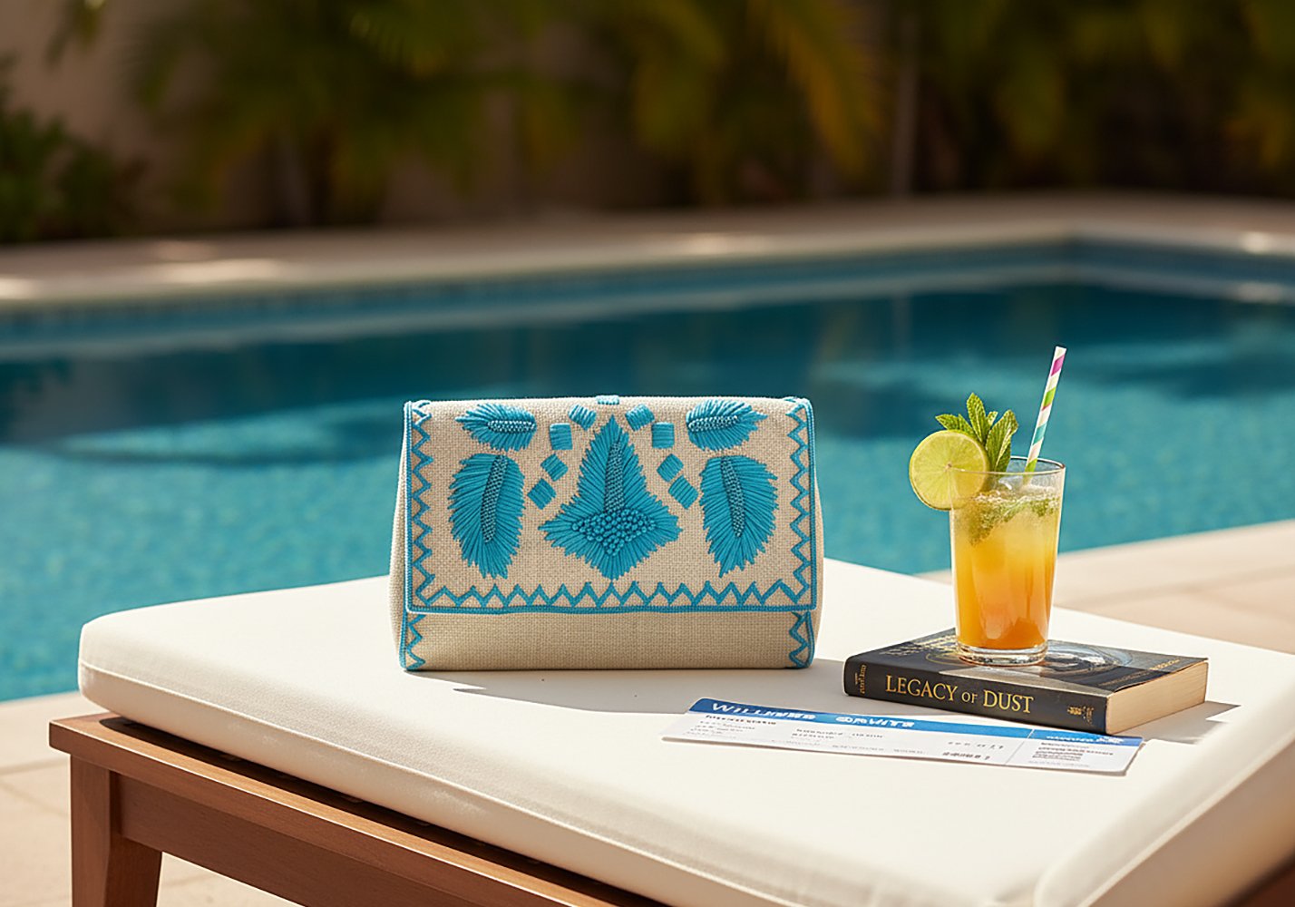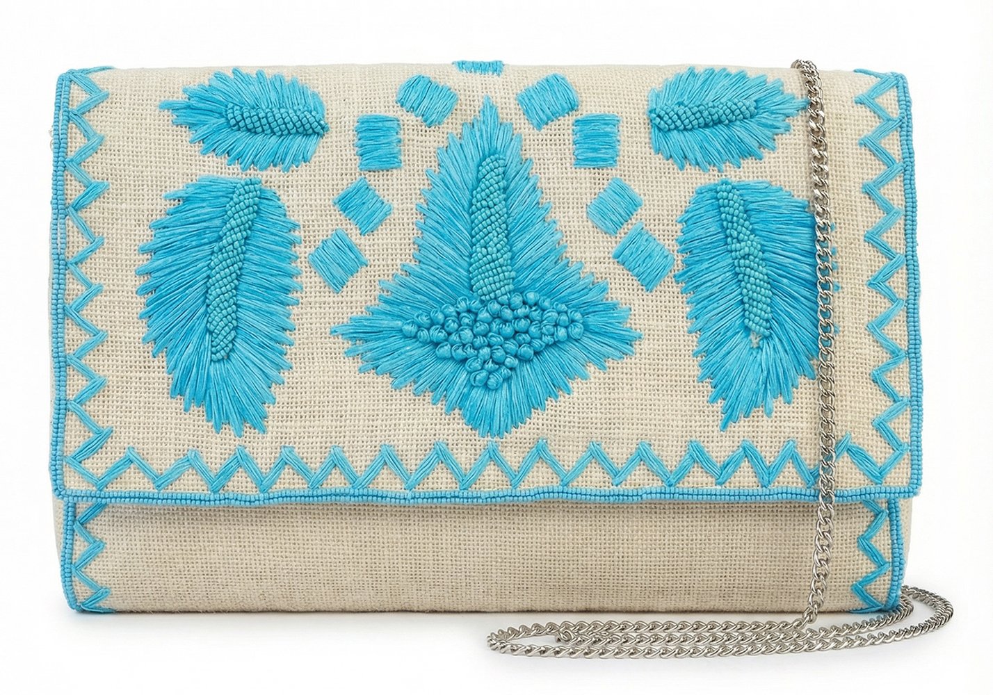 Il buta indiano – motivo antico e simbolico – è lavorato con cura su un azzurro intenso, profondo, quasi ceruleo. Il disegno non è invasivo: è definito, equilibrato, e dialoga con la texture della juta creando un contrasto sofisticato tra struttura e ornamento.