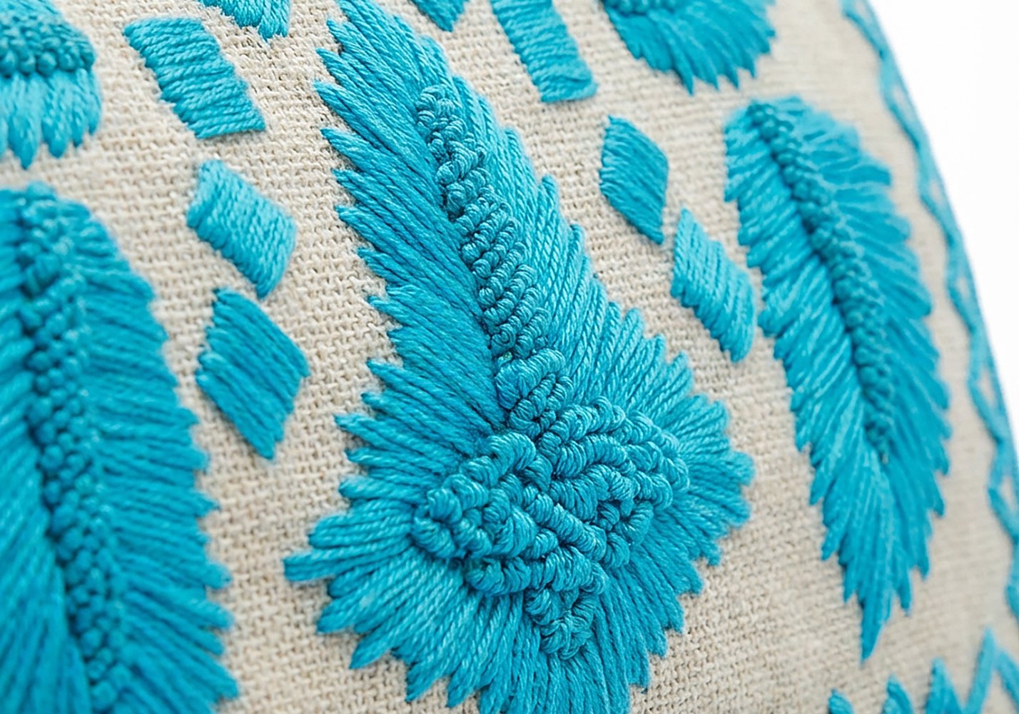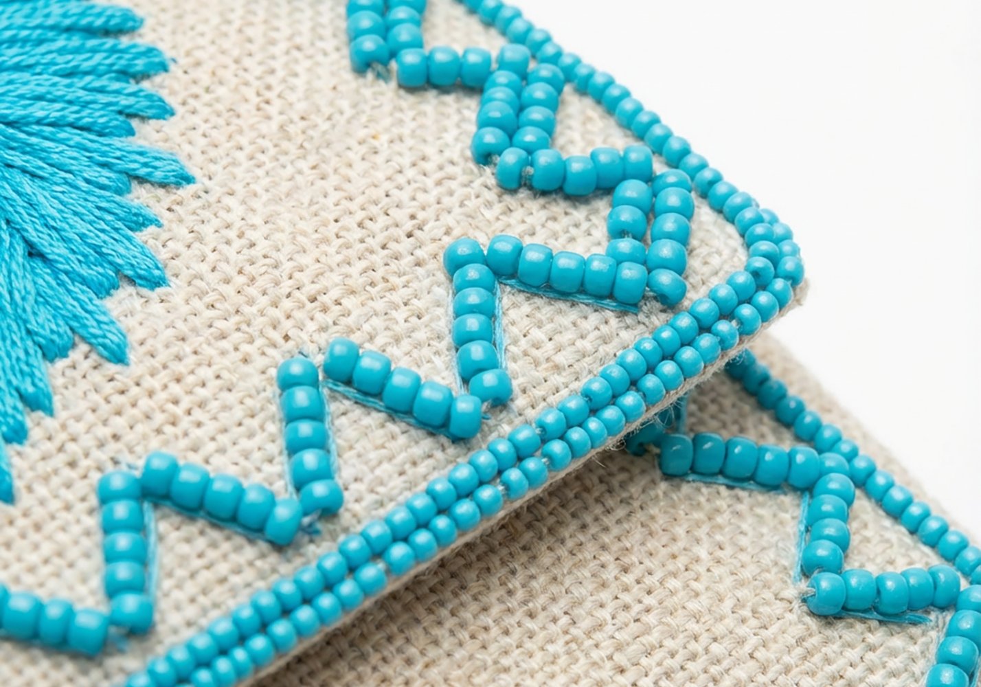 La juta naturale, con la sua trama leggermente irregolare e viva, crea una base autentica, quasi grezza, che contrasta con la precisione del ricamo centrale.