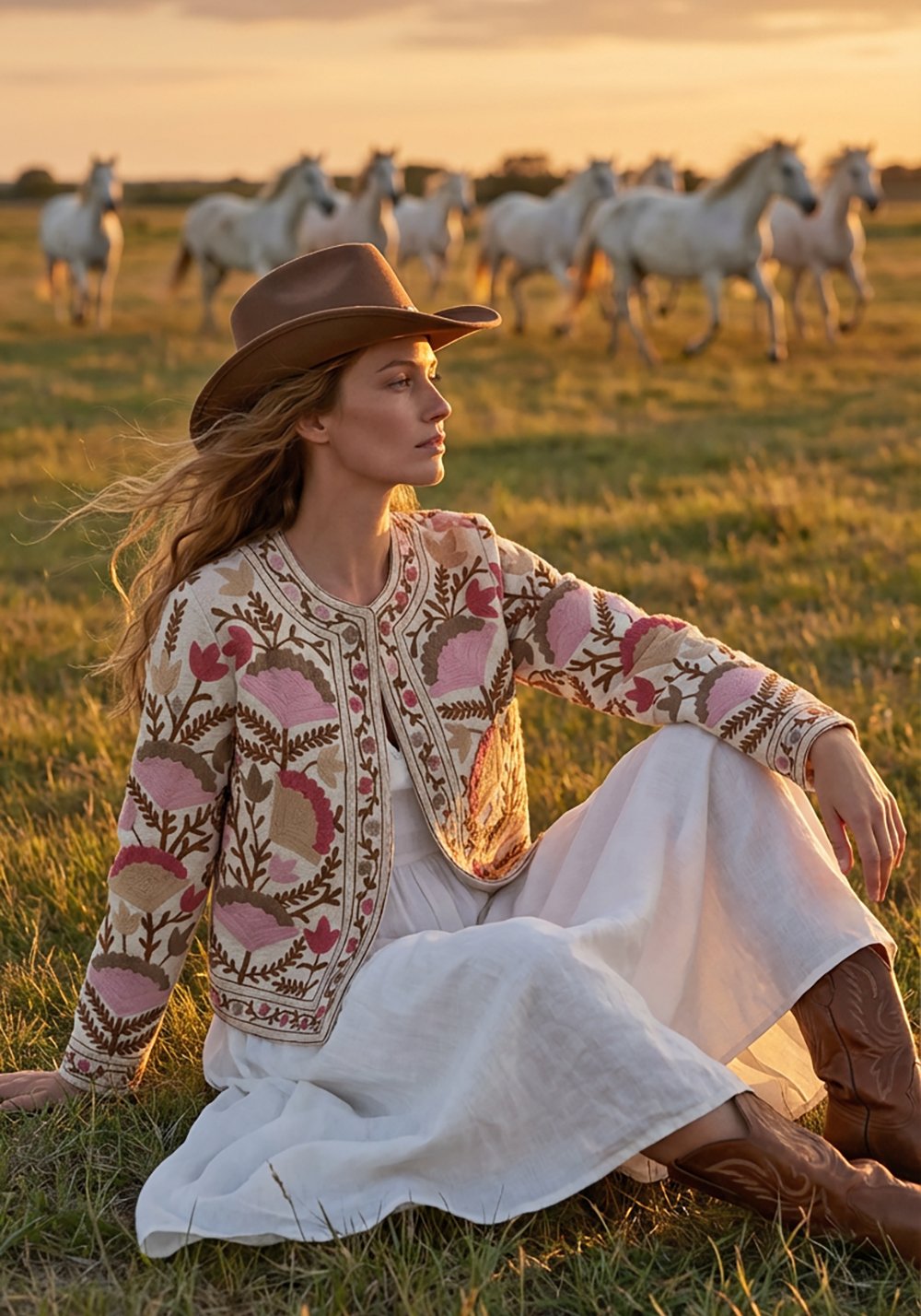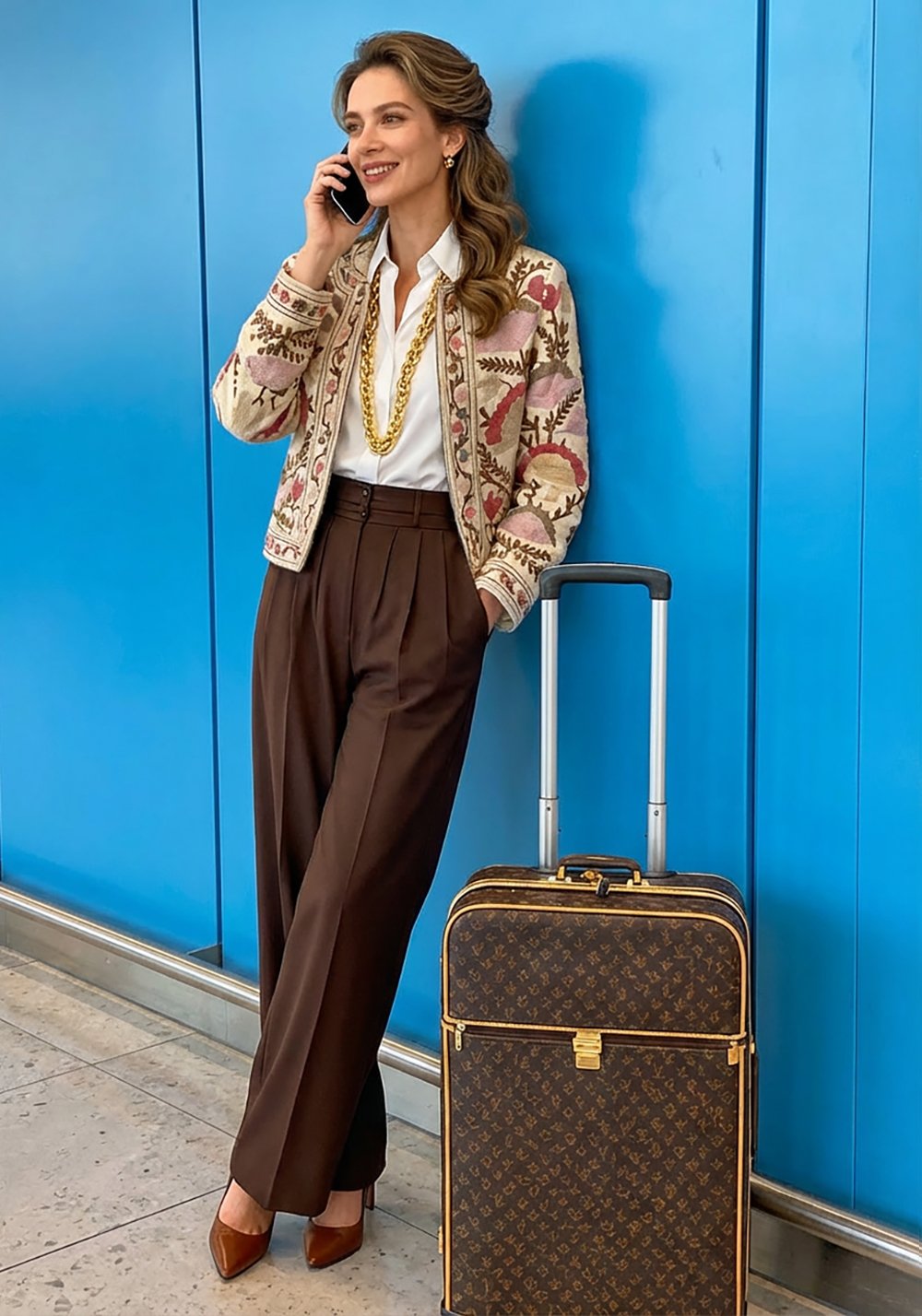 La struttura della giacca resta pulita, con una linea definita che bilancia la ricchezza del ricamo. Questo equilibrio tra base compatta e decorazione intensa la rende un capo di carattere, ma portabile.