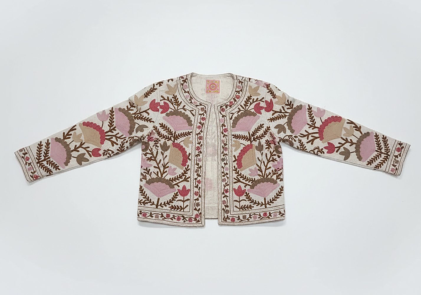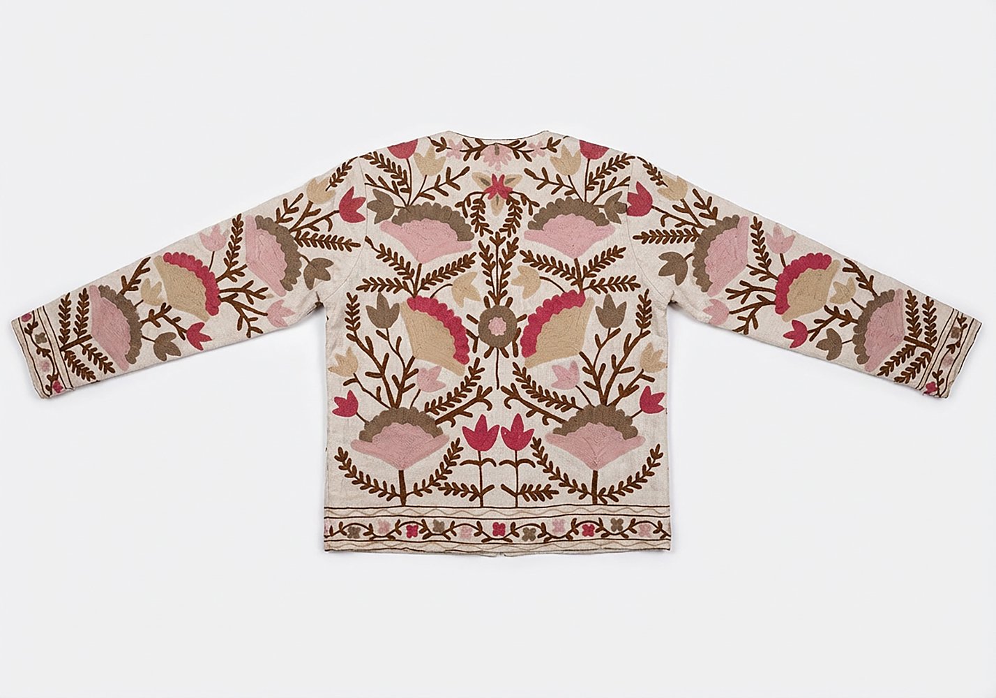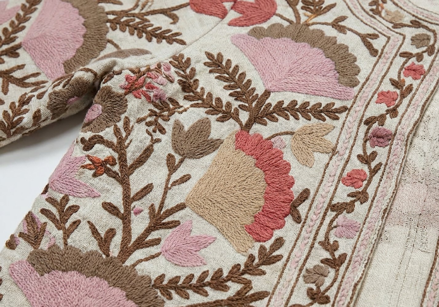 Una base rosa calda, avvolgente, che fa da sfondo a un ricamo floreale fitto e ricercato. I fiori non sono semplici motivi decorativi: sono costruiti con filo pieno, con variazioni di densità che danno rilievo e profondità alla superficie.