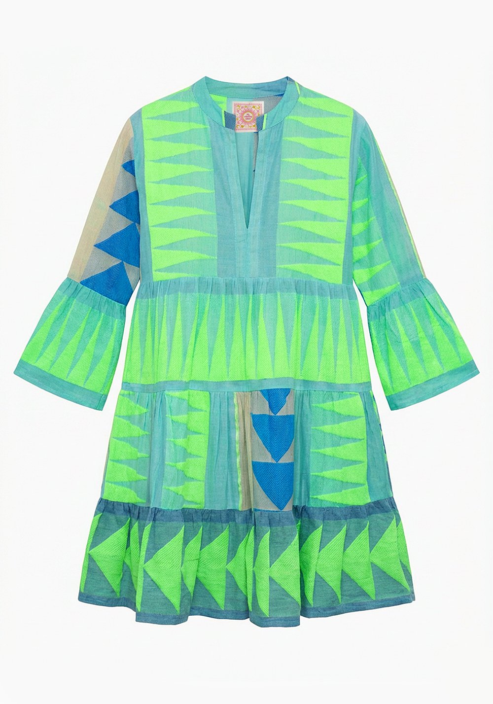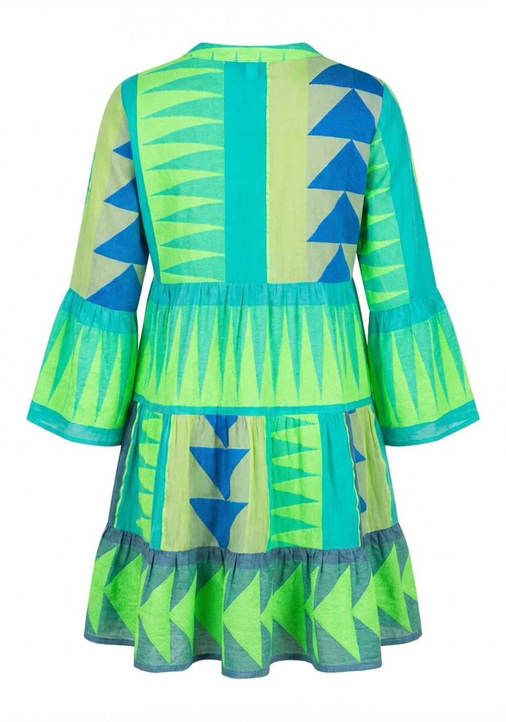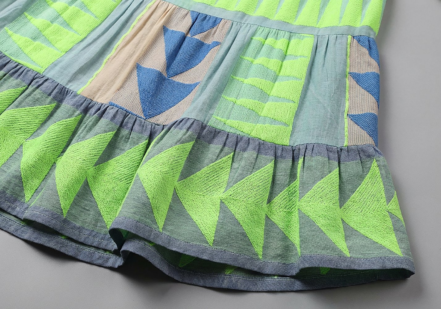 Il triangolo, netto e deciso, si alterna in sequenze che ricordano paesaggi desertici, ombre e linee scolpite dal sole. Il verde intenso dialoga con accenti più scuri, rendendo il disegno vibrante ma ordinato.