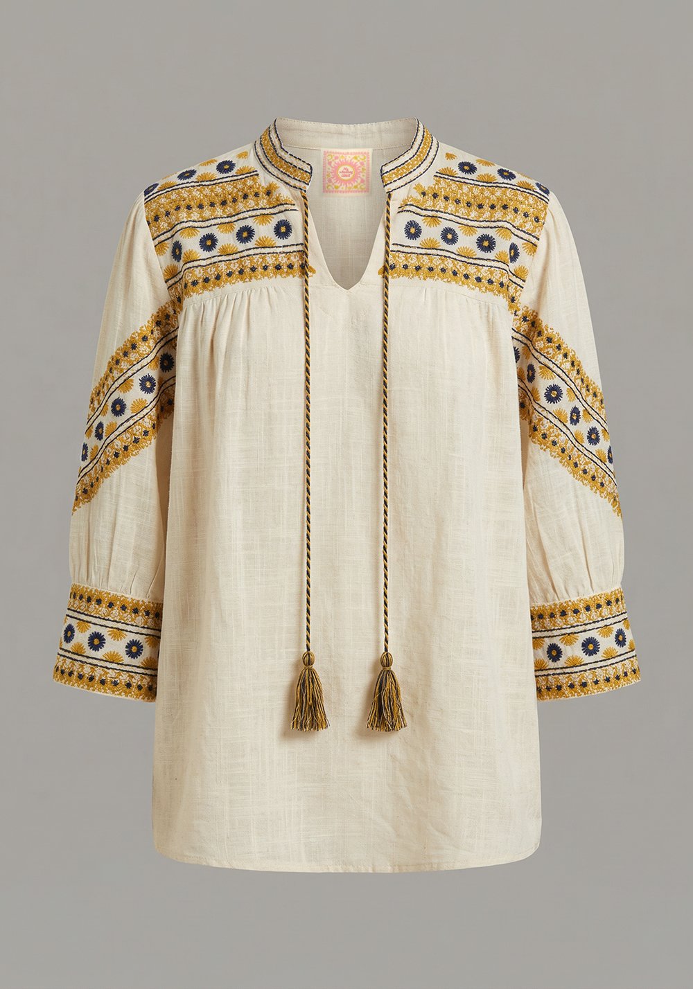 Questa blusa presenta un ricamo floreale giallo e blu in vari punti. I motivi floreali sono definiti, armonici, con un equilibrio cromatico che unisce il blu profondo alla luce calda del giallo.