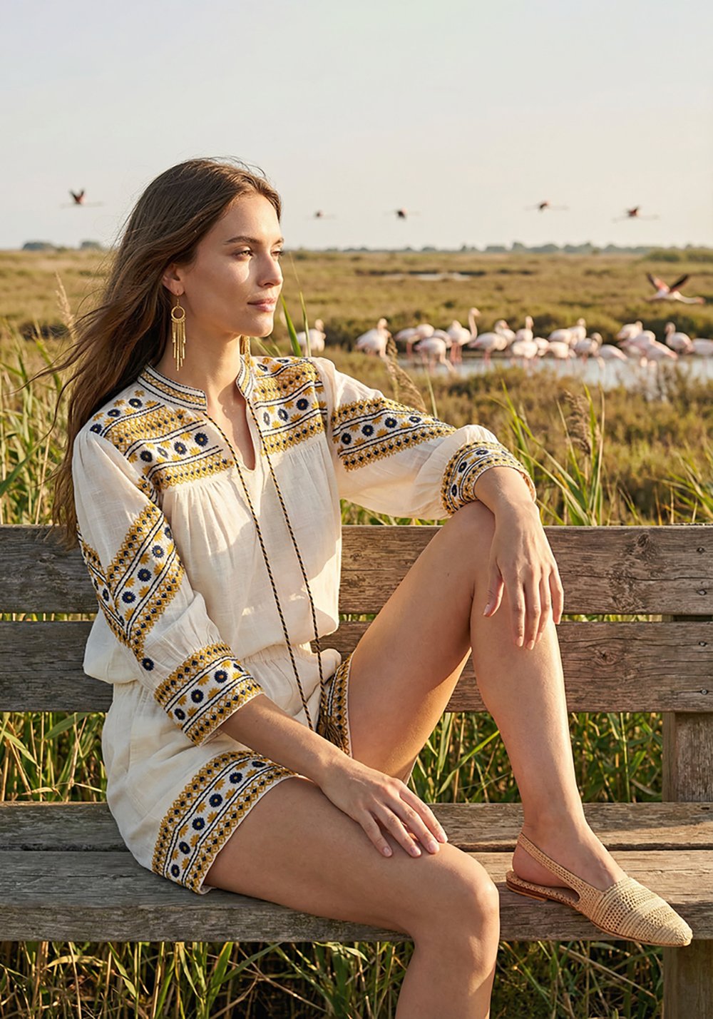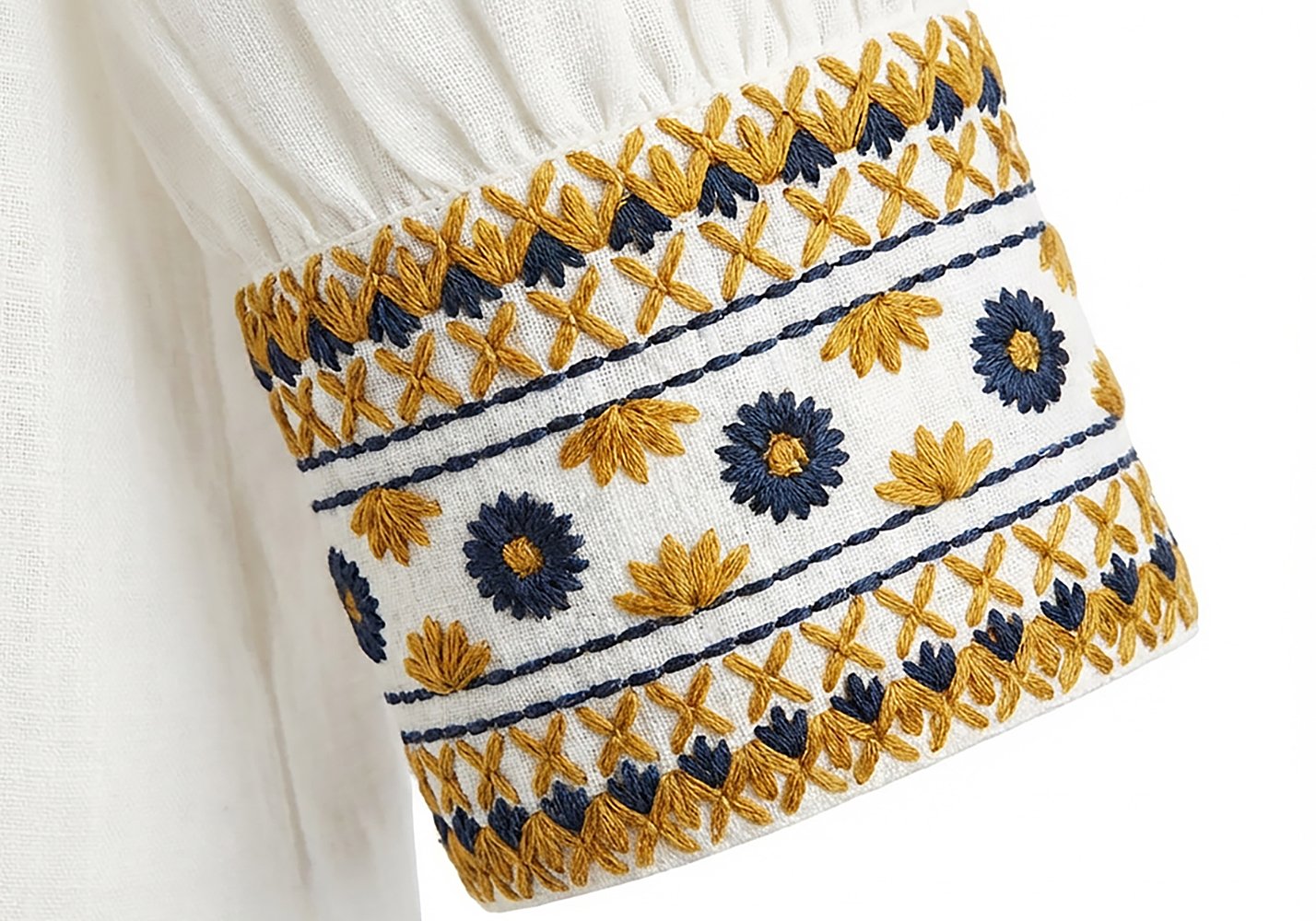 Il tessuto in misto lino e cotone mantiene freschezza e struttura allo stesso tempo: è leggero sulla pelle, ma non cede nella forma. Il ricamo, leggermente materico al tatto, aggiunge profondità e rende il capo visivamente più ricco rispetto a una semplice stampa.
