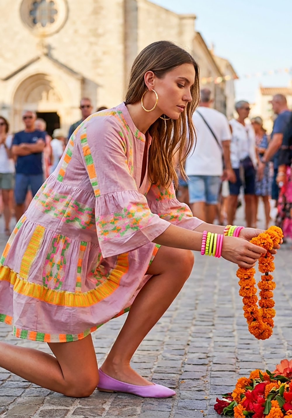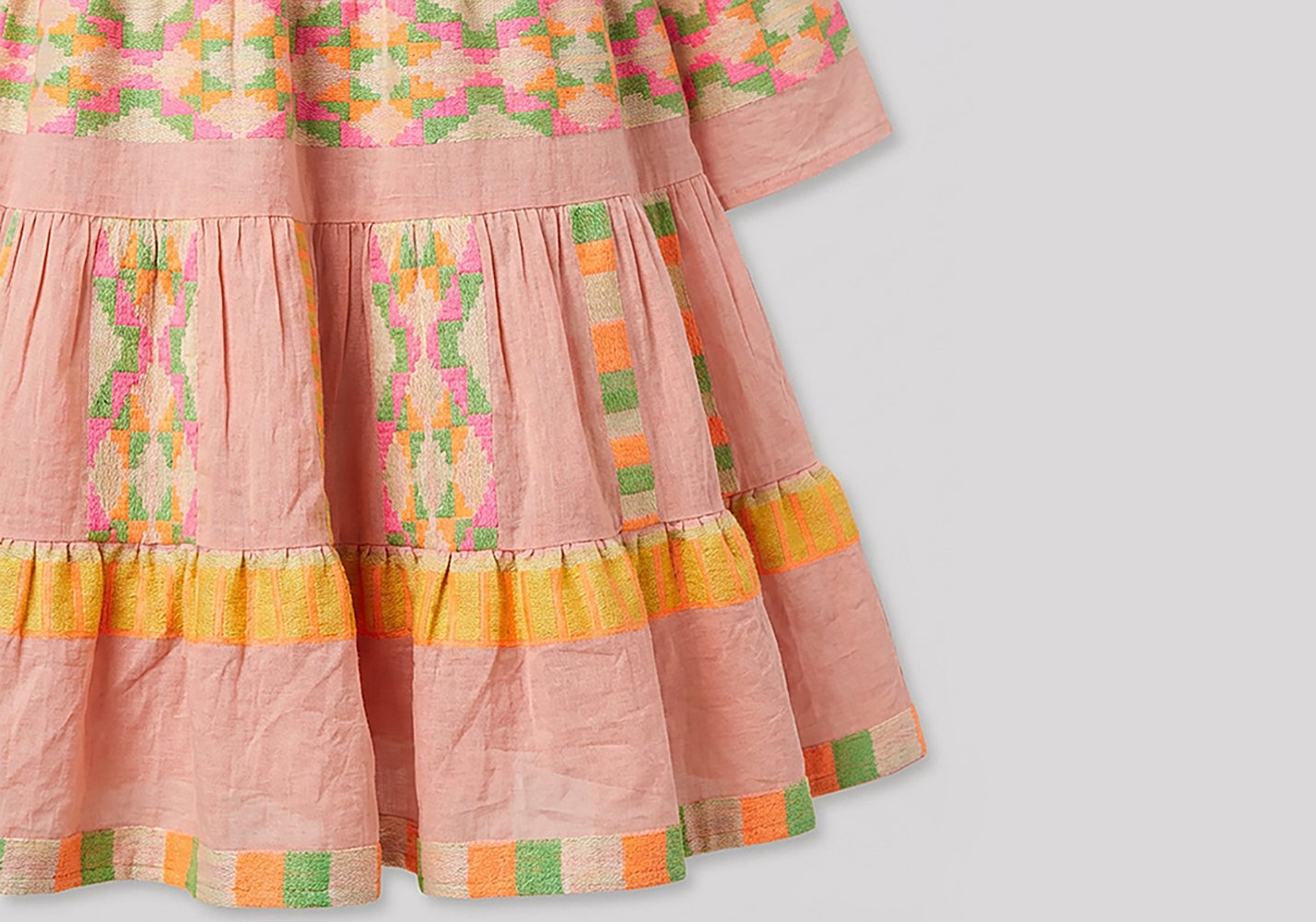 La linea mini resta pulita, lasciando che sia il dialogo tra arancione e verde a costruire il carattere del capo.