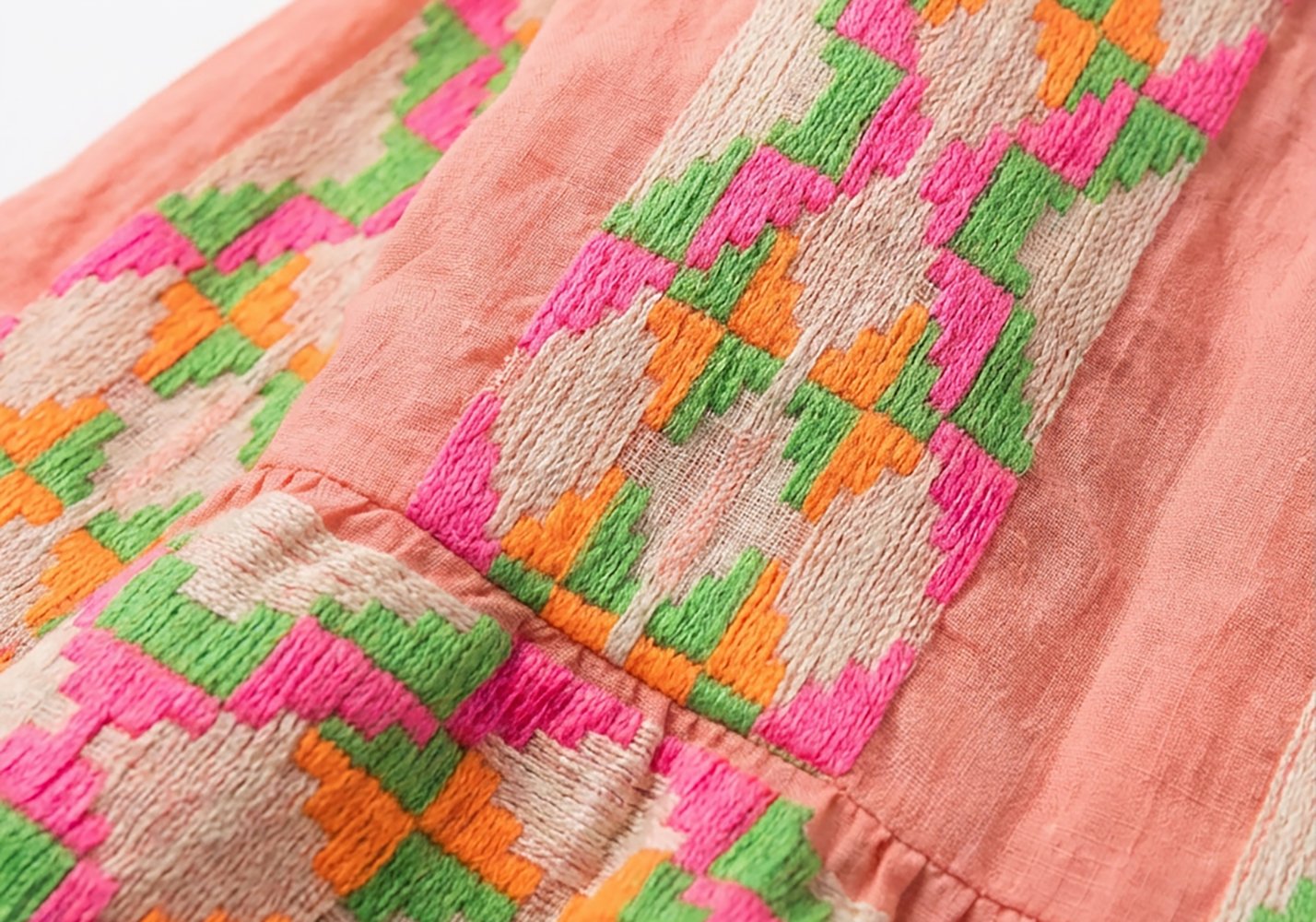 L’arancione acceso è il colore dominante: caldo, solare, pieno. Dentro la trama si intrecciano accenti verdi che spezzano e bilanciano la forza del tono principale, creando un effetto visivo dinamico ma studiato.