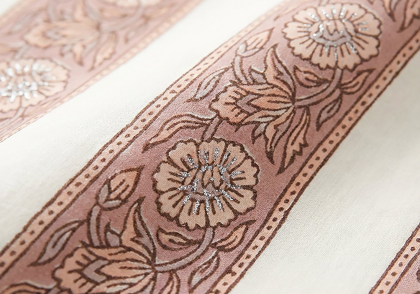 La base lilla, ispirata ai campi di lavanda, è arricchita da piccoli punti argentati che catturano la luce in modo discreto ma prezioso. La stampa manuale mantiene quel ritmo leggermente irregolare che rende il tessuto vivo, mai piatto.