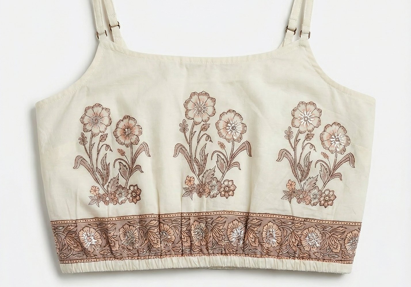 Un top con block print lilla, impreziosito da micro punti argentati che riflettono la luce con discrezione. Non è un effetto brillante dichiarato: è un dettaglio che si scopre nel movimento, quando il tessuto prende aria e luce.