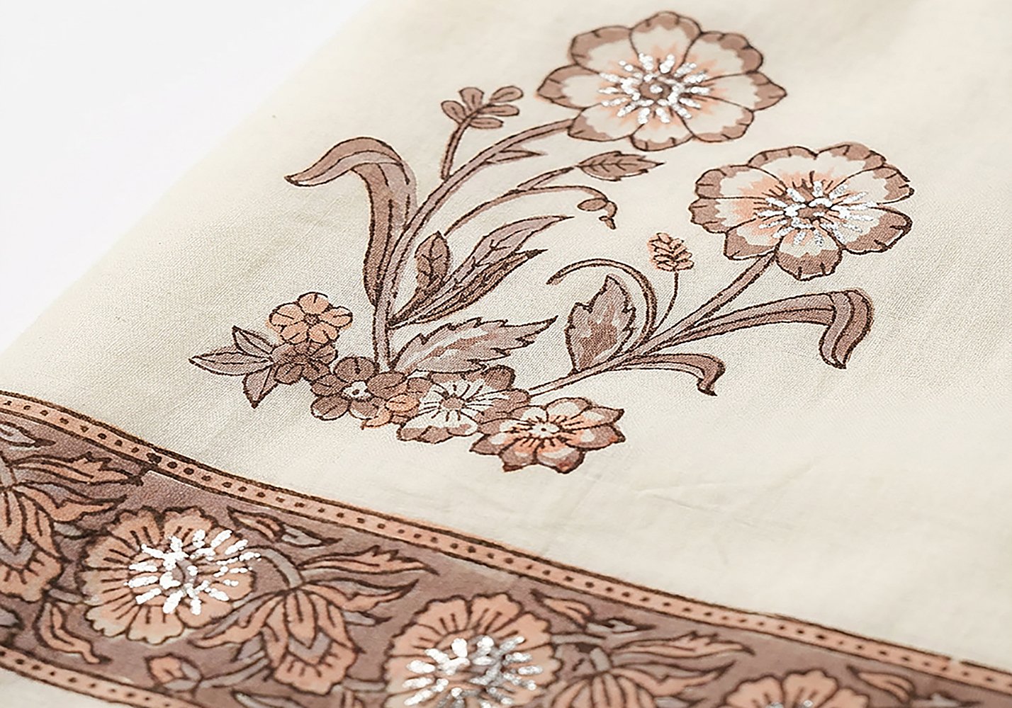 La stampa manuale mantiene la sua anima autentica, con leggere variazioni che raccontano la lavorazione artigianale. Il cotone resta leggero e naturale al contatto, mentre i tocchi argento aggiungono una dimensione più ricercata.